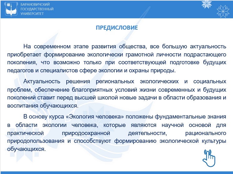 Экология человека : электронный учебно-методический комплекс / сост. С. К. Рындевич, Г. М. Леванова // Хранилище электронных ресурсов учреждения образования "Барановичский государственный университет". - Барановичи, 2023. - URL: https://erstorage.barsu.by/