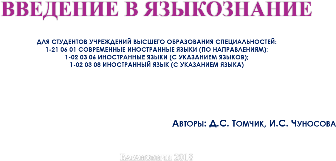 Введение в языкознание : электронный учебно-методический комплекс для студентов учреждений высшего образования / сост.: Д. С. Томчик, И. С. Чуносова // Хранилище электронных ресурсов учреждения образования "Барановичский государственный университет". - Барановичи, 2018. - Режим доступа: https://erstorage.barsu.by/
