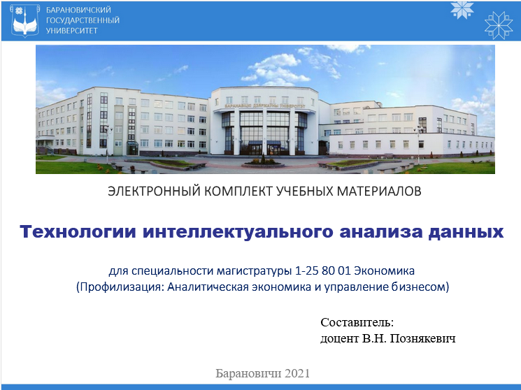 Технологии интеллектуального анализа данных : электронный комплект учебных материалов для специальности магистратуры 1-25 80 01 Экономика (Профилизация: Аналитическая экономика и управление бизнесом) / сост. В. Н. Познякевич // Хранилище электронных ресурсов учреждения образования "Барановичский государственный университет". - Барановичи, 2021. - URL: https://erstorage.barsu.by/