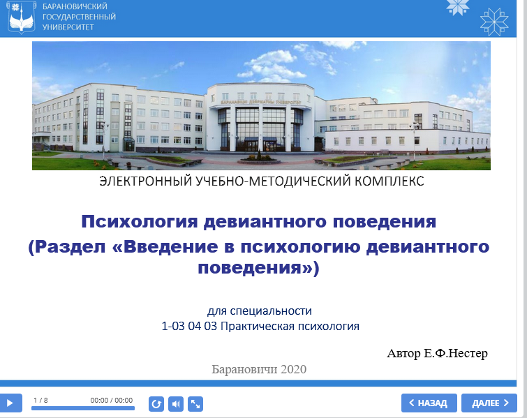 Психология девиантного поведения (раздел "Введение в психологию девиантного поведения") : электронный учебно-методический комплекс для специальности 1-03 04 03 Практическая психология / сост. Е. Ф. Нестер // Хранилище электронных ресурсов учреждения образования "Барановичский государственный университет". - Режим доступа: https://erstorage.barsu.by/