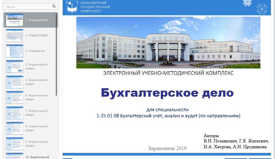 Бухгалтерское дело : электронный учебно-методический комплекс / сост.: В. Н. Познякевич, Г. Я. Житкевич, И. А. Хитрова, А. Н. Прудникова // Хранилище электронных ресурсов учреждения образования "Барановичский государственный университет". - Барановичи, 2019. - URL: https://erstorage.barsu.by/